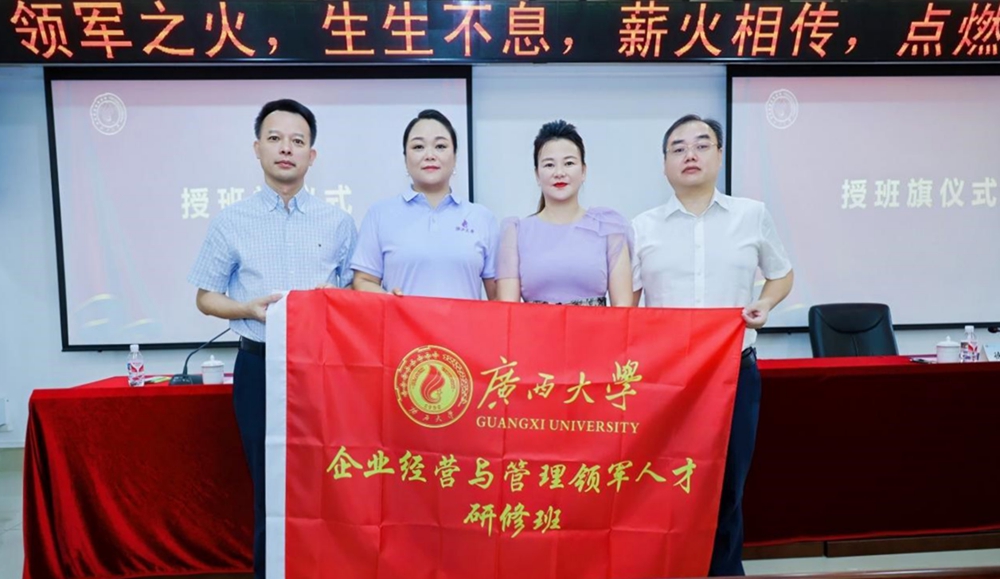开班仪式最后环节,闭富春院长、徐华副院长为班主任梁艳及班长孙波授予广西大学领军人才研修班班旗。
