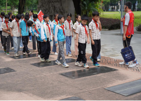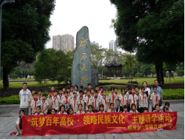 【校史探寻】 在育才广场整队集结后,研学团队沿着镌刻时光印记的校史长廊缓步前行。孩子们的手指轻抚过镌刻着1928年建校年份的铜质浮雕,在研学导师的讲解中,九十七载弦歌不辍的办学历程渐次展开。当队伍行至综合楼前,全体师生在毛泽东主席亲笔题写的校名匾额下合影留念,镜头定格了少年们仰望高等学府的憧憬目光。