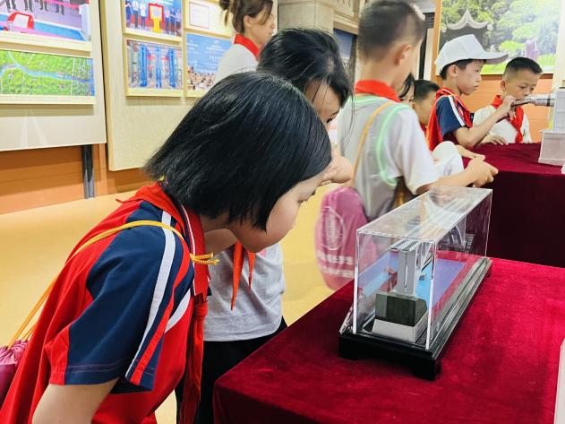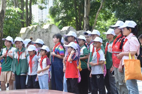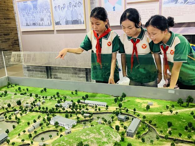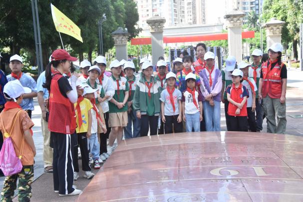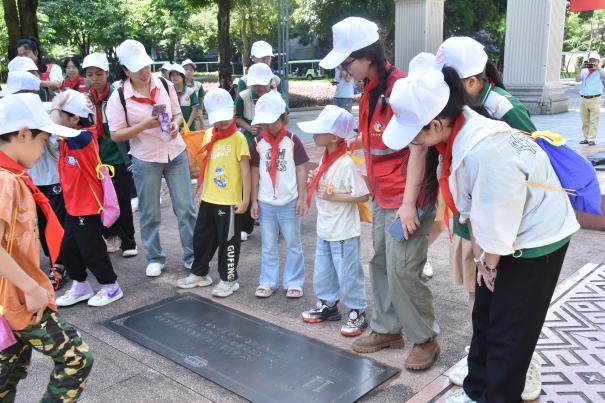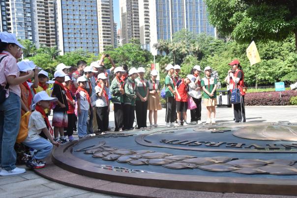 同学们来到广西大学,跟着志愿者“学姐”一起步行游览校园。在育才广场,听学姐讲解“梧州建校—桂林兴校—西迁榕江—南宁复校”的历史,巨幅时光轴和记录学校历史重大事件的浮雕等深深吸引了同学们,纷纷驻足拍照留念。