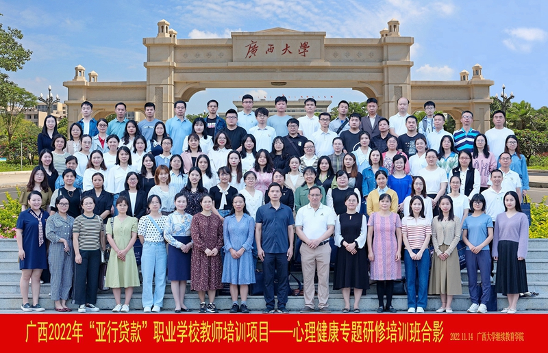 为提高职业院校心理健康教育专兼职教师开展心理辅导、心理干预、心理调节、心理防控等能力和水平,11月13日至19日,由广西壮族自治区教师培训中心主办、我校继续教育学院承办的广西2022年“亚行贷款”职业学校教师培训项目—心理健康专题研修培训班在广西大学继续教育学院举办,来自全区高职院校、区直中职学校和地市中职学校的心理健康教育专兼职教师共98名参加培训。