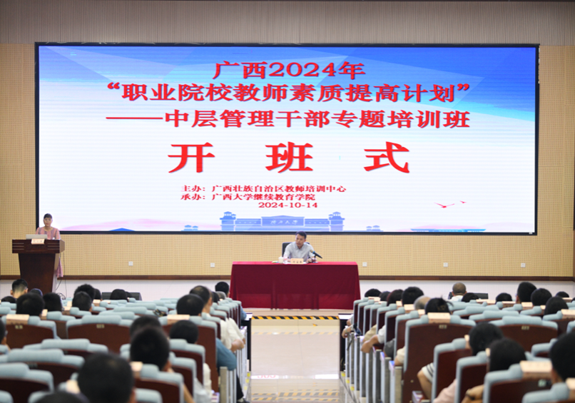 10月14日上午,广西2024年“职业院校教师素质提高计划”——中层管理干部专题培训班在广西大学开班,我院院长闭富春出席开班式并致辞。