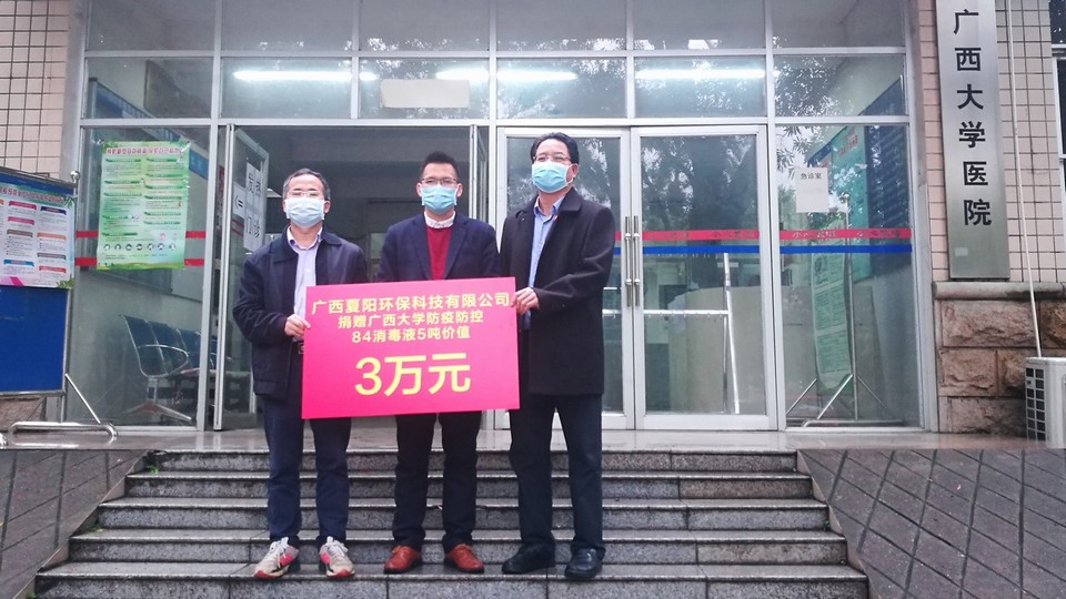 据悉,夏阳环保一直致力于环保治理方案的研究,助力生态文明建设,推动绿色发展。面对新型冠状病毒感染的肺炎疫情,夏阳环保用实际行动,践行自己的社会责任。自2月2日起,广西夏阳环保科技有限公司及其下属单位公司,陆续向我区部分市县和单位捐赠了价值300多万元的500多吨消毒剂。目前受赠的单位有河池市、来宾市、合山市、都安瑶族自治县、天峨县、象州县、武宣县、忻城县、金秀瑶族自治县、广西大学等。(陈义群)
