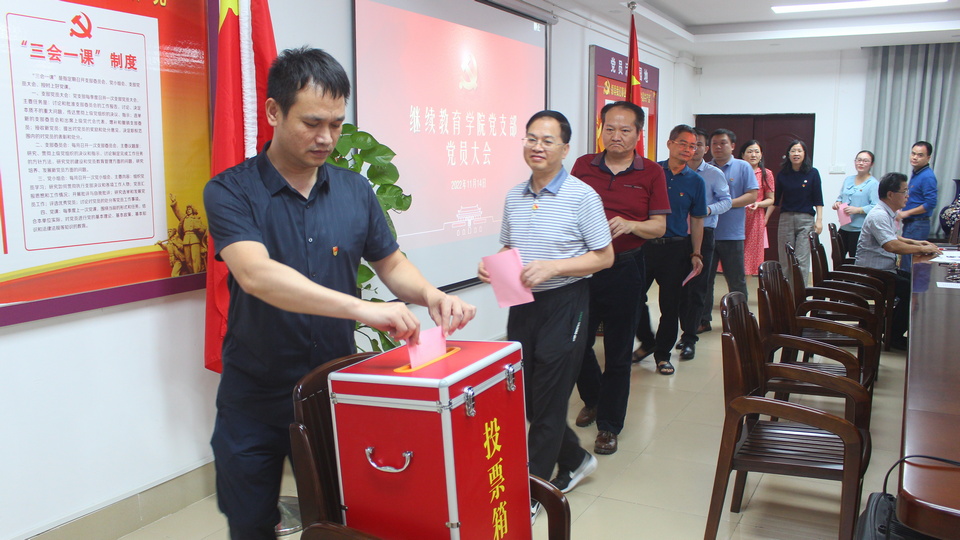 2022年11月14日,继续教育学院党支部召开党员大会,审议、表决通过继续教育学院党支部委员会工作报告、选举办法、候选人名单和监计票人名单,选举产生继续教育学院党支部新一届委员会委员。(陈昊宇/文图)