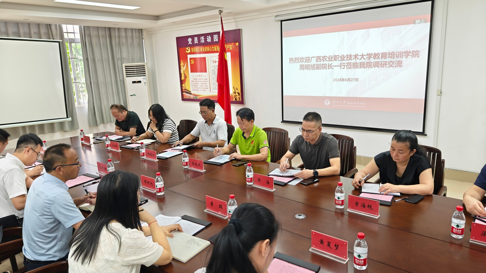 2024年6月27日,广西农业职业技术大学教育培训学院副院长周明旭一行到我院调研交流。学院领导班子、有关中心负责同志参加座谈。(陈昊宇/图)