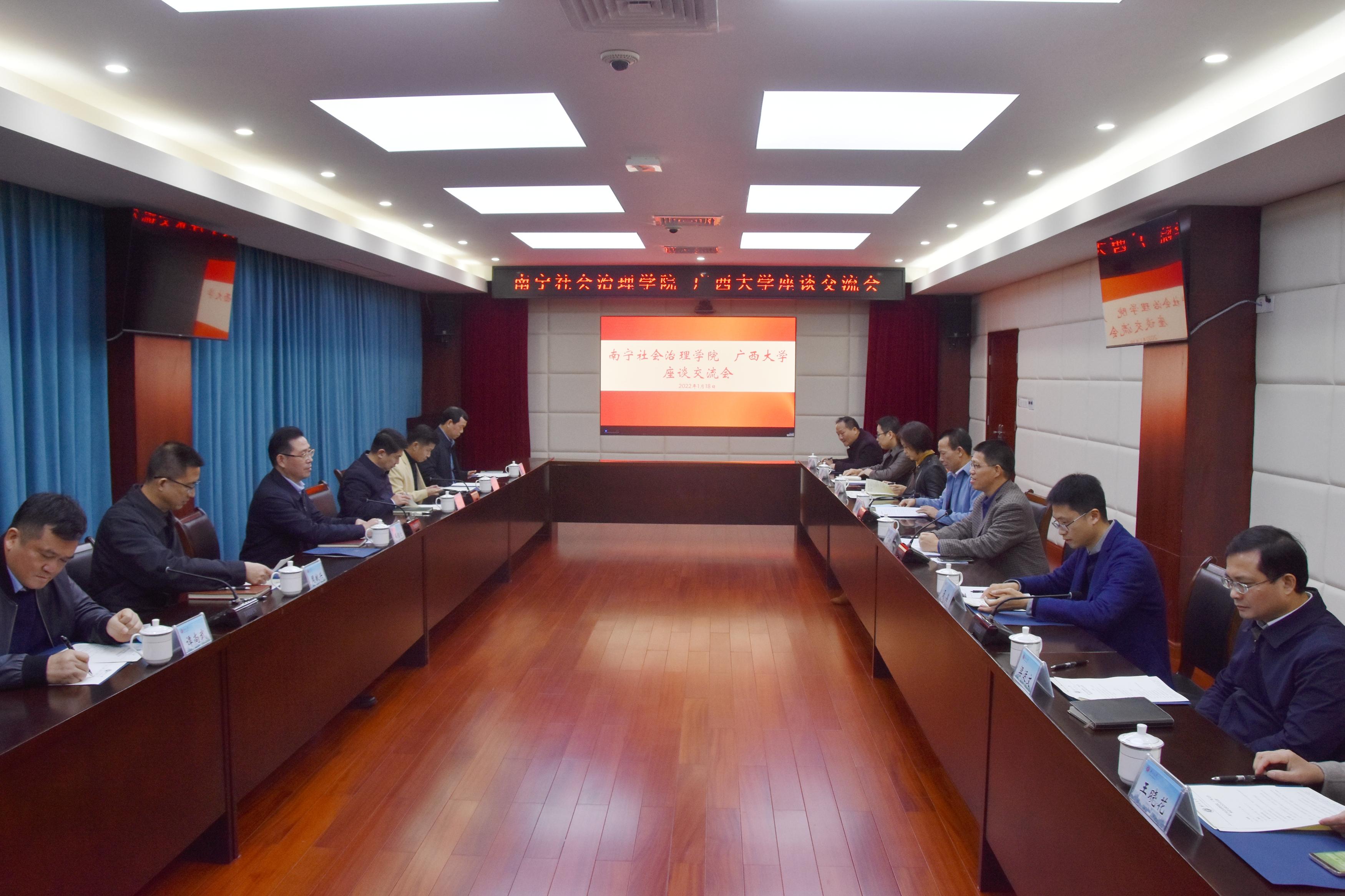 会议听取了南宁市党委政法委、广西大学继续教育学院关于南宁市社会治理学院建设背景、建设历程、建设模式、工作开展情况及人才培养等相关情况介绍。与会人员就如何在南宁社会治理学院取得成就的基础上共同推动成立广西社会治理学院进行了深入交流。