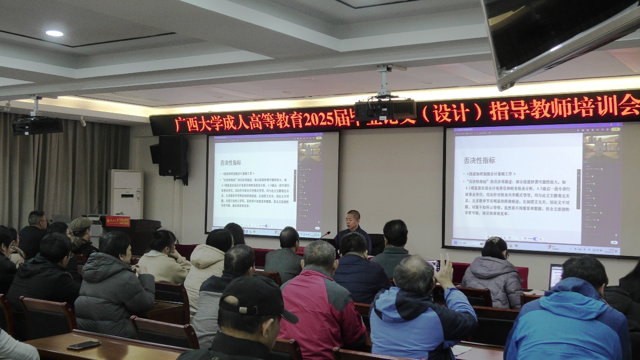 为进一步提升我校成人高等教育本科毕业论文(设计)质量,确保毕业论文(设计)工作顺利进行,继续教育学院于2024年12月12日晚举办广西大学成人高等教育2025届毕业论文(设计)指导教师培训会。我校教育教学质量监控与评价中心副主任、教学督导团副团长王恩界教授受邀作专题报告,培训会由继续教育学院副院长陈海主持。