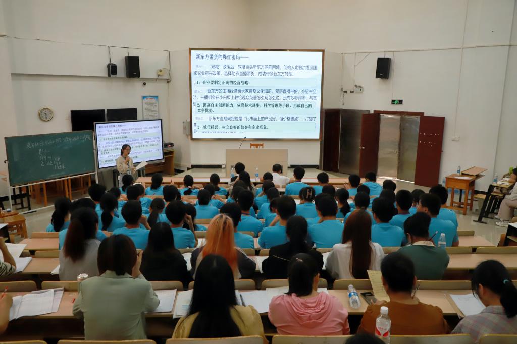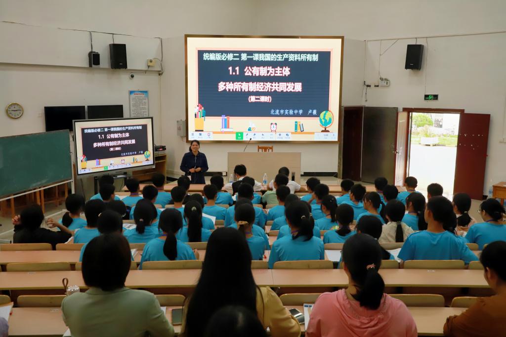 卢薇授课题目为《公有制为主体,多种所有制经济共同发展》。课上,她先引导学生回顾北流市的发展,以建设北流北站为契机,教学环节模拟竞标活动,采取“开标——答辩——中标”的方式进行授课。同时,她组织学生以小组合作的形式进行讲解分享,并为学生们讲解了公有制经济和非公有制经济的相关内容。