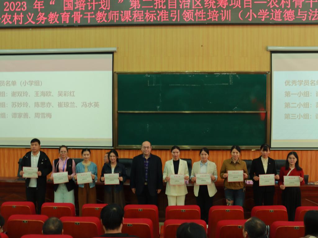 黄映然向圆满完成各项培训任务的全体学员表示祝贺,向给予项目支持的单位和个人表示感谢。他指出,本次培训学习内容丰富多彩,课程设置针对性强,师资力量配置高,教学形式多样、方法灵活、互动性强,培训效果得到培训学员的一致认可,培训工作取得良好成效。黄映然以都安中学为例,结合自己多年的思政教学与管理经验,向参训学员提出三点要求:一是要有道有爱,作为道德与法治学科的骨干教师要有高尚的道德情操和热爱本职工作与学生的情怀;二是要因材施教,掌握学生成长规律,培养学生全面发展;三是久久为功,坚持在教师岗位上发光发热,希望学员们能够理论联系实际,学以致用,把从培训中学习到的知识和技能运用到今后的教学、教研和教改工作中去,争取早日成为教学名师,在平凡的工作岗位创造出不平凡的业绩。