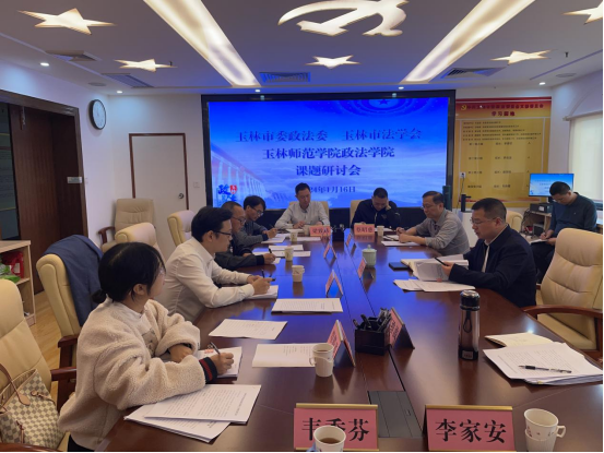 1月16日,玉林市委政法委、玉林市法学会、中国·yL23411永利课题研讨会在玉林市委政法委召开。研讨会由玉林市委常委、政法委书记、市法学会会长、党组书记黄宏瞻主持。市委政法委副书记、市法学会常务副会长郑维波、市法学会专职副会长兼秘书长苏志东、市委政法委办公室主任李家安、市综治中心主任蔡昭慈等领导出席会议。我院院长周伟萌、副院长朱顺、法学教研室主任覃腾英和彭本利教授参与研讨会。