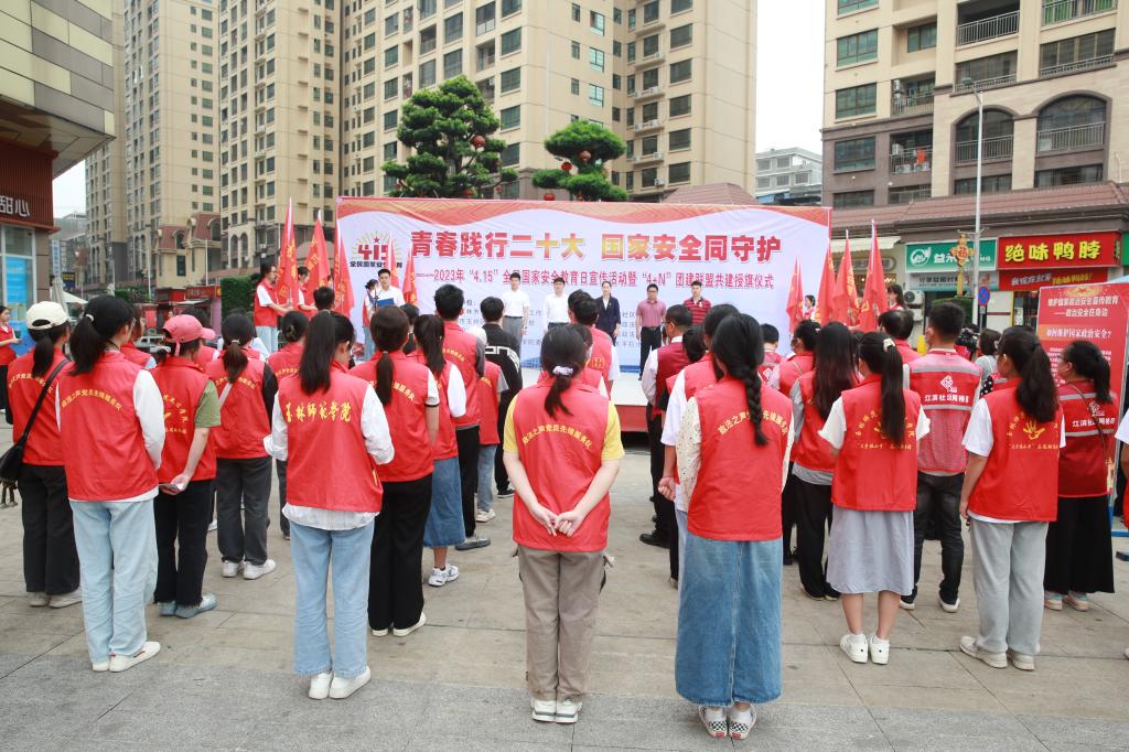 为深入学习贯彻党的二十大精神,弘扬爱国主义主旋律,牢固树立总体国家安全观在新时代国家安全工作中的指导地位,结合党旗领航群团联动,实现校地共建融合发展,资源共建共享。4月14日上午,中国·yL23411永利联合玉州区江南街道办事处在玉州区南兴广场举行青春践行二十大·国家安全同守护——2023年“4.15”全民国家安全教育日暨“4+N”团建联盟共建授旗仪式。