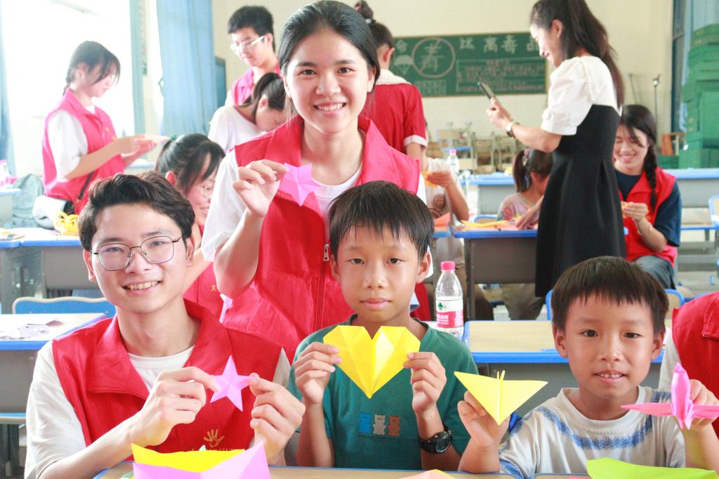 在乡村课堂上、社区里,志愿者积极带动学生和家长们制作手工作品。在学习折纸的过程中,学生集中注意去观察折线所处的位置,在思考的过程中不断探索怎样拉折、翻转,然后动手进行纸张的折叠以及最后的裁剪,并认真制作出五角星、钻石心等一系列手工作品。