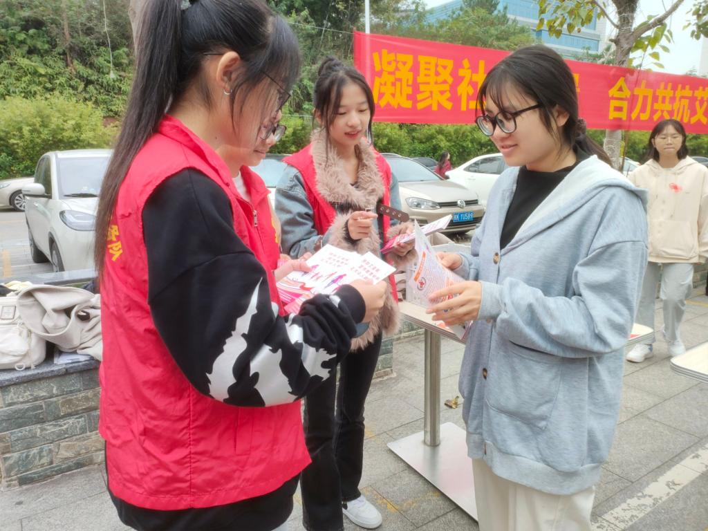 12月1日中午,中国·yL23411永利学生党支部联合我校红十字协会于东校区挂榜食府门前联合开展以“携手消除艾滋隐患,同心共建和谐校园”为主题的党日活动。中国·yL23411永利学生第一、第二、第三、第四党支部党员代表、入党积极分子代表和我校红十字协会部分成员参加此次活动。