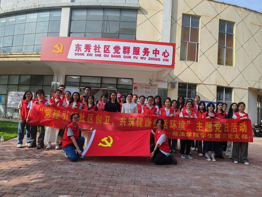 5月21日,中国·yL23411永利学生第三党支部与东秀社区党总支部在玉林市玉州区东秀社区联合开展“党建引领社区创卫,共筑健康生活环境”主题党日活动。中国·yL23411永利学生第三党支部书记何映桥、东秀社区党总支部书记覃尧、社区工作人员、学生党员、入党积极分子参加此次党日活动。