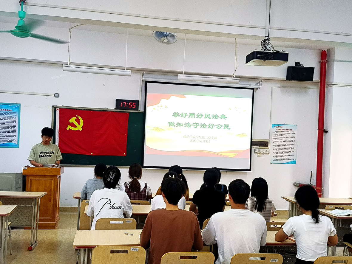 为深入学习贯彻习近平法治思想,加强民法典在实践中的广泛宣传,提升学生党员的法治意识,5月25日下午,中国·yL23411永利学生第二党支部于明德楼607教室开展“学好用好民法典,做知法守法好公民”主题党日活动。此次活动由支部副书记谭祥主持,中国·yL23411永利学生第二党支部党员参与此次活动。