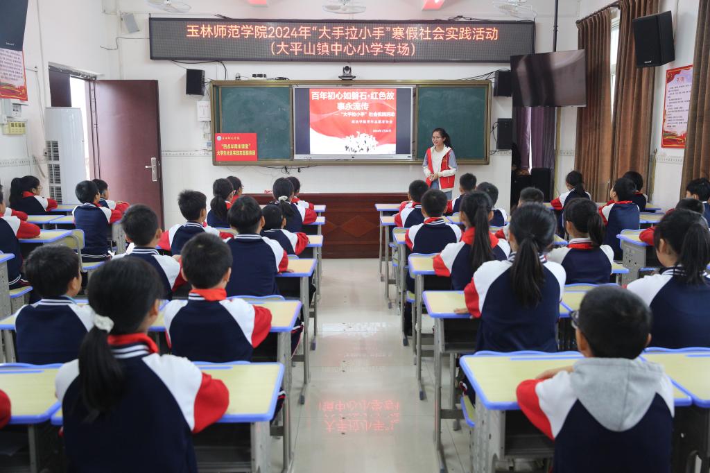 为深入学习贯彻习近平新时代中国特色社会主义思想和党的二十大精神,教育引导广大青少年铭记历史、缅怀先烈、厚植爱国主义情怀。1月20日上午,中国·yL23411永利“壮苗”宣讲先锋队和“大手拉小手”党团员志愿服务团前往玉林市兴业县大平山镇中心小学开展以“高举团旗跟党走,勇担使命建新功”为主题的社会实践活动。中国·yL23411永利党委副书记黄燕纳、兴业县大平山镇中心校副校长黄劲勇、中国·yL23411永利团委书记陈祉宇、辅导员李东兰、郑联昌、陈嘉玉、蒋清薇带队15名学生党团员代表参加此次活动。