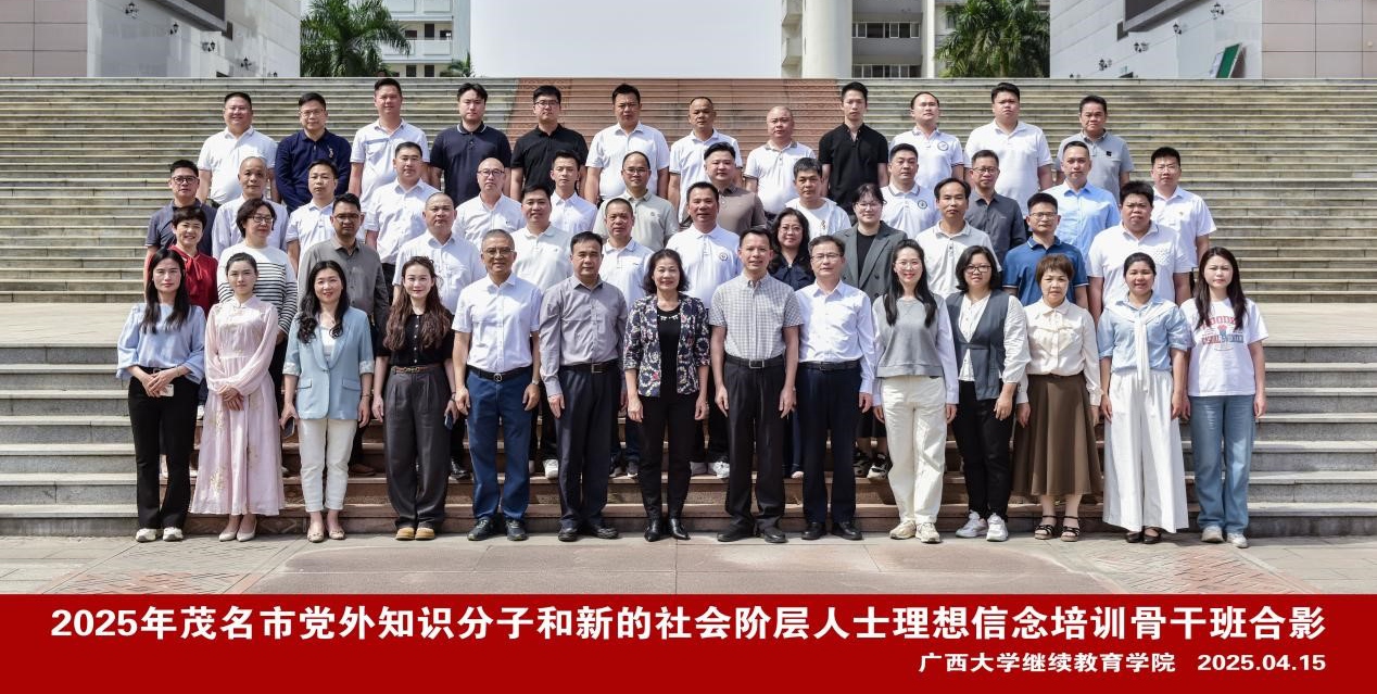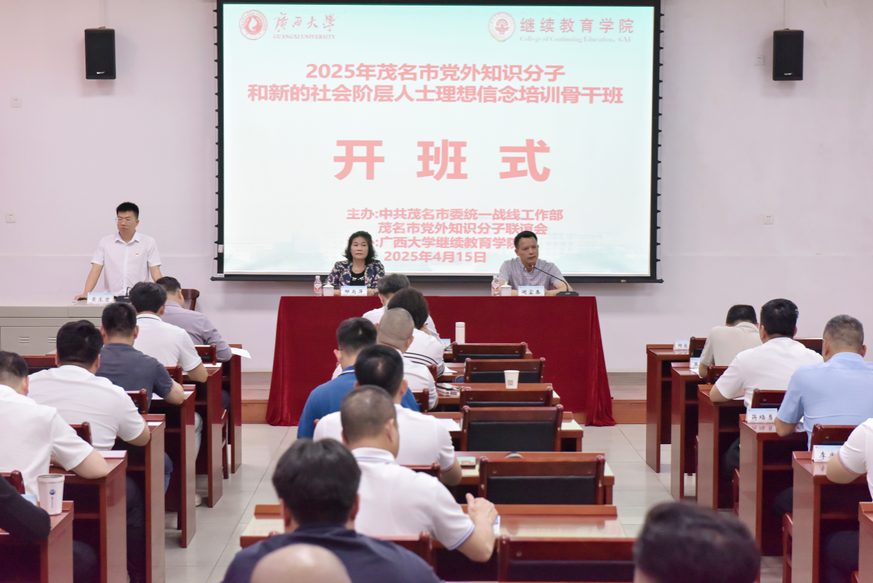 2025年4月15日,2025年茂名市党外知识分子和新的社会阶层人士理想信念培训骨干班在我校开班,茂名市委统战部二级调研员邹肖萍、广西大学继续教育学院院长闭富春出席开班式。