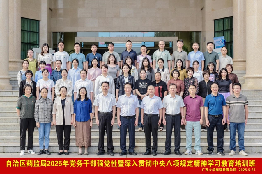 2025年5月27日,自治区药监局2025年党务干部强党性暨深入贯彻中央八项规定精神学习教育培训班在我校开班。自治区药监局党组成员、副局长、机关党委书记韦广辉,广西大学继续教育学院院长闭富春出席开班式并讲话,自治区药监局机关党委专职副书记文杰主持开班式。