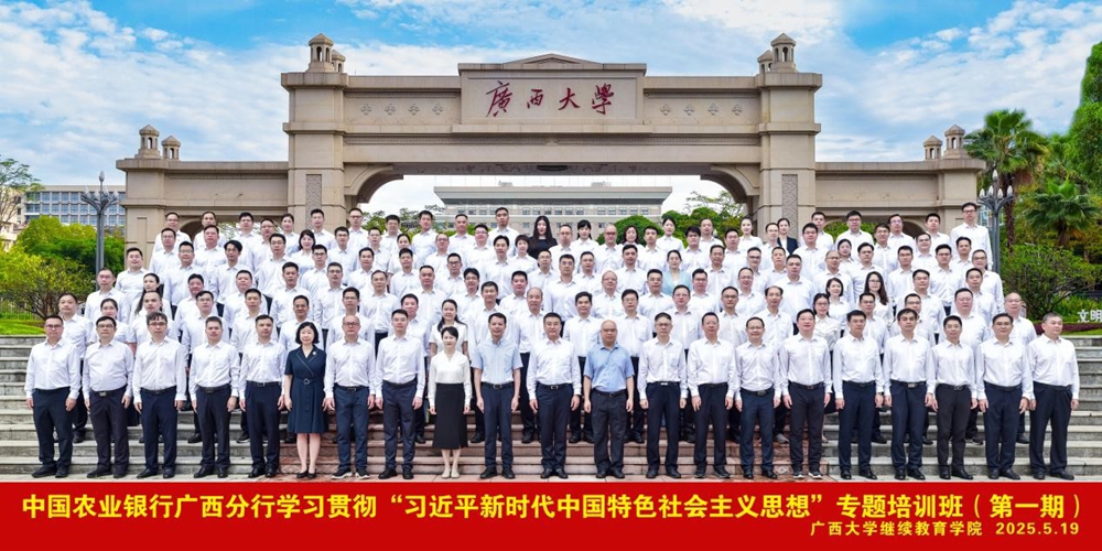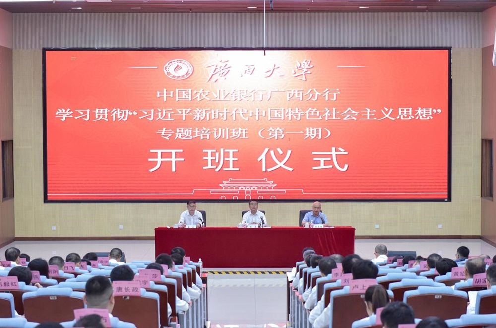 2025年5月19日上午,由中国农业银行广西分行主办、我院承办的中国农业银行广西分行学习贯彻习近平新时代中国特色社会主义思想专题培训班(第一期)在我校举行开班仪式。中国农业银行广西分行党委书记、行长张清,广西大学党委常委、副校长梁恩维出席开班式并讲话。