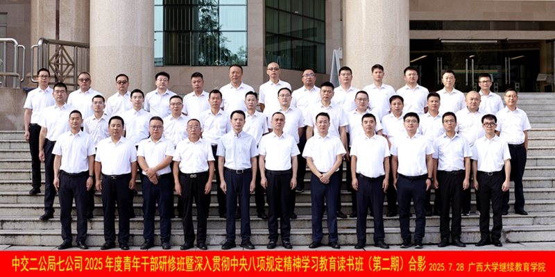 7月28日,中交二公局第七工程有限公司2025年度青年干部研修班暨深入贯彻中央八项规定精神学习教育读书班(第二期)在我校开班。中交二公局第七工程有限公司党委副书记、总经理宁波,广西大学继续教育学院院长闭富春出席开班式并讲话,中交二公局第七工程有限公司人力资源部经理孙超主持开班式。
