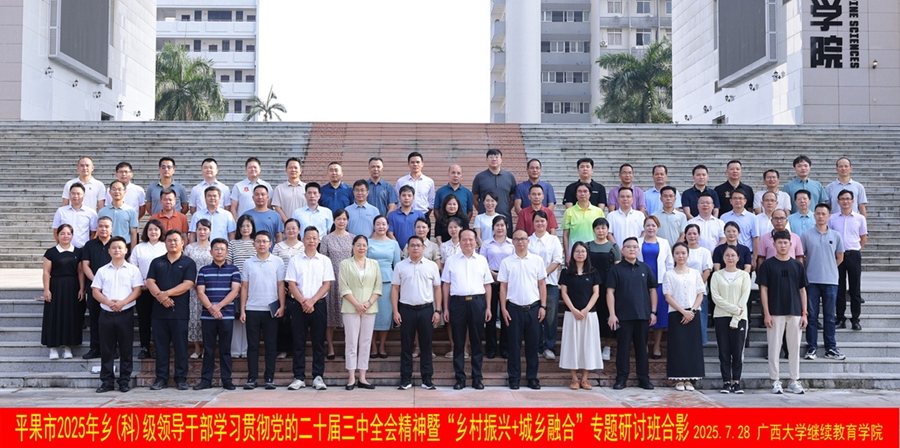 7月28日,平果市2025年乡(科)级领导干部学习贯彻党的二十届三中全会精神暨“乡村振兴+城乡融合”专题研讨班在我校开班。中共平果市委组织部副部长、市老干部局局长(兼)阮俊杰,广西大学继续教育学院干部培训中心主任黎耀凡出席开班式并讲话。