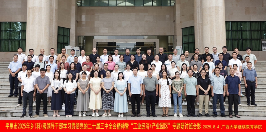 8月4日,平果市2025年乡(科)级领导干部学习贯彻党的二十届三中全会精神暨“工业经济+产业园区”专题研讨班在我校开班。中共平果市委组织部部务会成员、市党员教育中心主任陆香兰,广西大学继续教育学院干部培训中心李文副主任出席开班式并讲话。