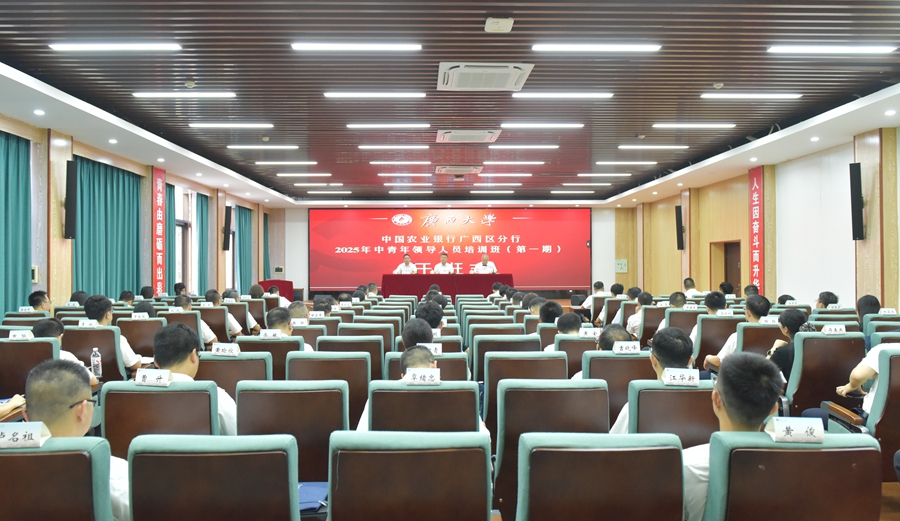 8月25日,中国农业银行广西区分行2025年中青年领导人员培训班(第一期)在我校开班,中国农业银行广西区分行党委书记、行长张清出席开班式并作动员讲话,广西大学党委常委、副校长刘向出席开班式并致辞,中国农业银行广西区分行党委组织部副部长、人力资源部副总经理王新华主持开班式。