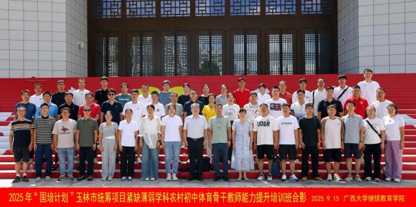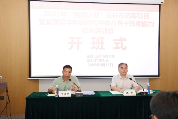 为深入贯彻落实国家关于新时代教师队伍建设改革的决策部署,提升农村初中体育骨干教师的专业能力与综合素养,2025年9月15日,由玉林市教育局统筹、广西大学承办的2025年“国培计划”玉林市统筹项目——紧缺薄弱学科农村初中体育骨干教师能力提升培训班在我校开班,玉林市教育局办公室主任、教师工作科负责人何勇坚和广西大学继续教育学院副院长徐华出席开班式并讲话,广西大学继续教育学院副教授范小俊主持开班式。