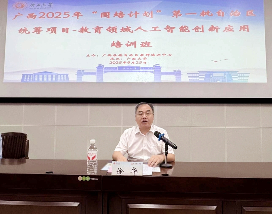 9月25日,广西2025年“国培计划”第一批自治区统筹项目——教育领域人工智能创新应用培训班在我校结业,广西大学继续教育学院副院长徐华出席结业式并致辞,广西大学继续教育学院梁君华老师主持结业式。
