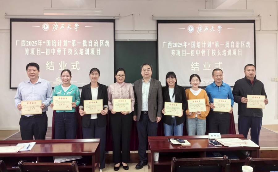 “国培计划”是落实《教育强国建设规划纲要(2024—2035年)》的重大实践。2025年10月24日,由广西壮族自治区教师培训中心主办,广西大学承办的2025年“国培计划”第一批自治区统筹项目——初中骨干校长培训班在我校结业。广西大学继续教育学院副院长徐华出席结业仪式并讲话。
