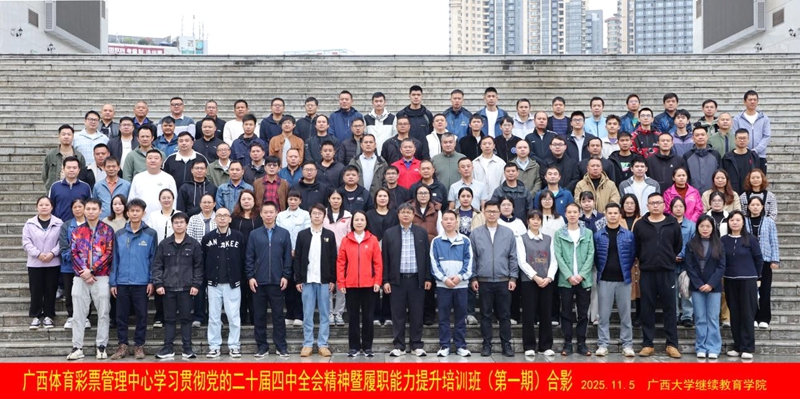 2025年11月5日,广西体育彩票管理中心学习贯彻党的二十届四中全会精神暨履职能力提升培训班(第一期)在我校开班,广西体育彩票管理中心党支部书记、副主任韦云珍出席开班式并讲话,广西大学继续教育学院副院长邓珍琪出席开班式并致辞。