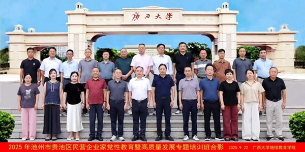 9月22日,2025年安徽省池州市贵池区民营企业家党性教育暨高质量发展专题培训班在我校开班,池州市贵池区人大常委会副主任、贵池区工商联主席张大春出席开班式并讲话,广西大学继续教育学院副院长徐华出席开班式并致辞。