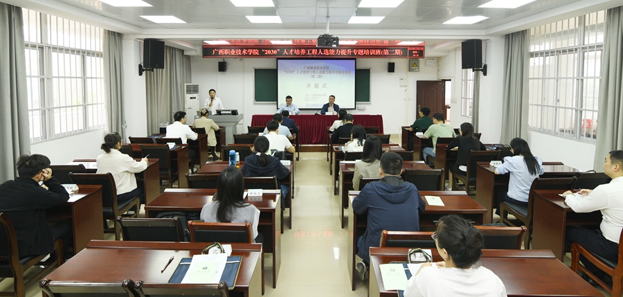 10月27日,广西职业技术学院“2030”人才培养工程人选能力提升专题培训班(第二期)在我校开班。广西职业技术学院党委委员、党委组织部(学院人事处、教师发展中心)部长(处长、主任)李继宏出席开班式并作动员讲话,广西大学继续教育学院院长闭富春出席开班式并致辞。