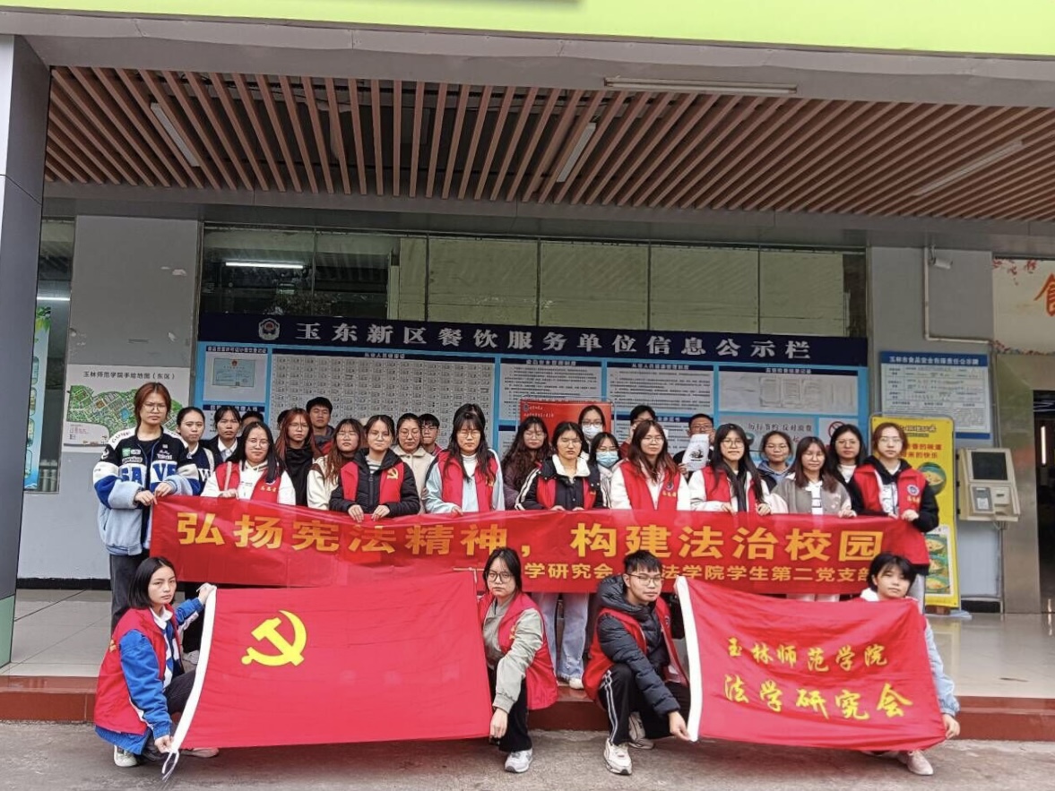 为了深入学习贯彻习近平新时代中国特色社会主义思想和党的二十大精神,进一步贯彻落实习近平法治思想,持续深入开展宪法宣传教育活动。12月5日中午,中国·yL23411永利学生第二党支部联合法学研究会于我校东校区挂榜食府门前开展“弘扬宪法精神,建设法治校园”主题党日活动。中国·yL23411永利学生第二党支部党员代表、入党积极分子代表、法学研究会部分会员参加此次党日活动。