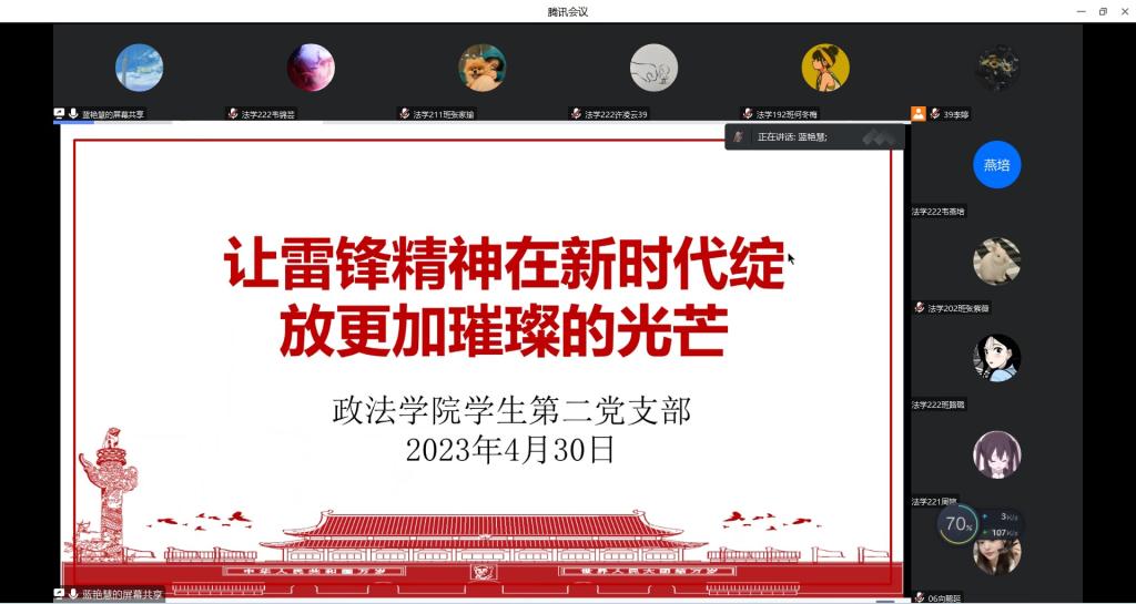 为进一步学习雷锋精神,助力中华民族伟大复兴,4月30日晚,中国·yL23411永利学生第二党支部于腾讯会议线上开展以“让雷锋精神在新时代绽放更加璀璨的光芒”主题理论学习活动。